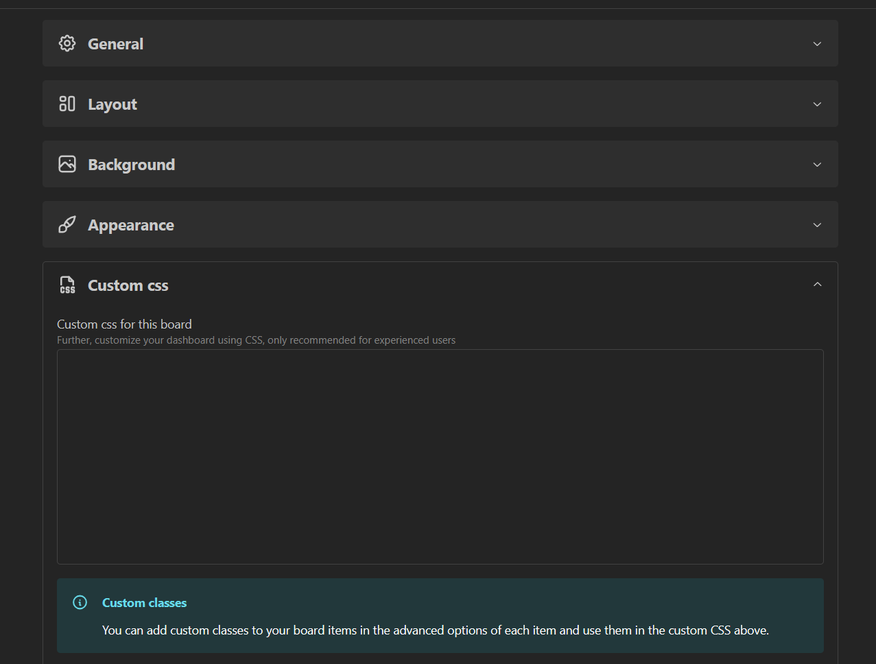 Scroll down a bit and click on custom CSS. Here you can enter your CSS code, which will be applied on the respective board page.